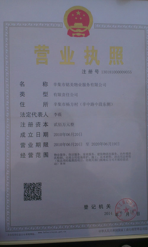 辛集銘美物業(yè)服務(wù)公司營(yíng)業(yè)執(zhí)照