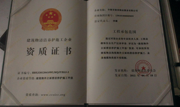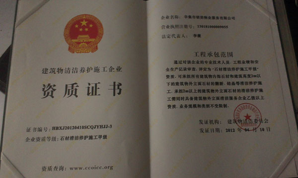 石材清潔養(yǎng)護(hù)施工甲級(jí)證書